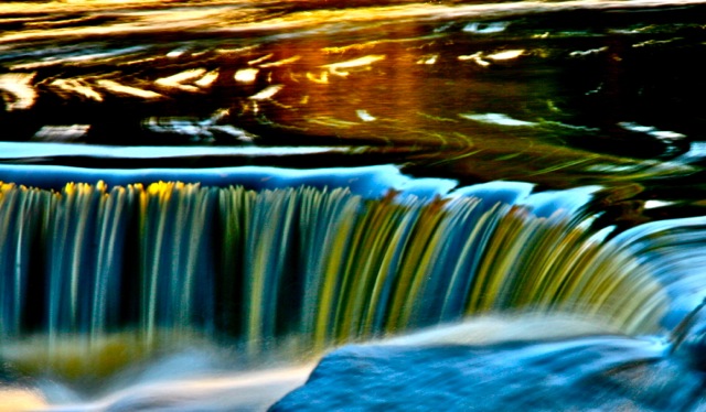 “We arrived at the Presque Isle River late in the day, with the sun behind us and a clear, blue sky. The only thing that looked interesting was the color of the water as it picked up the reflection of the maple trees on the opposite shore. We put our cameras on tripods and took the longest exposures we could get on our cameras — and my favorite result was this first photo below. It is another abstract one, and I liked it enough to have an enlargement made and framed for our family room. As we took them, we joked that these first photos would probably be the best ones of the trip. And they were.