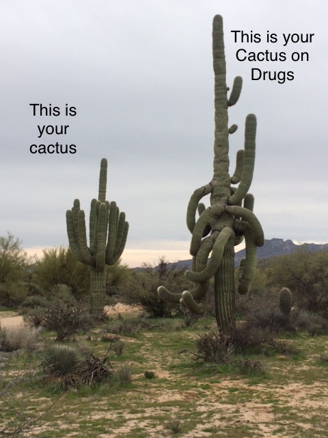 The Doryman of Prescott, Wisconsin, rose to joegolfer‘s implicit challenge [BB, 2/15/2017], to write a caption for these saguaros joegolfer saw in Arizona recently. He added a P.S.: “I do make out a sitting primate in the middle of the curly cactus. Perhaps it has a monkey on its back?”