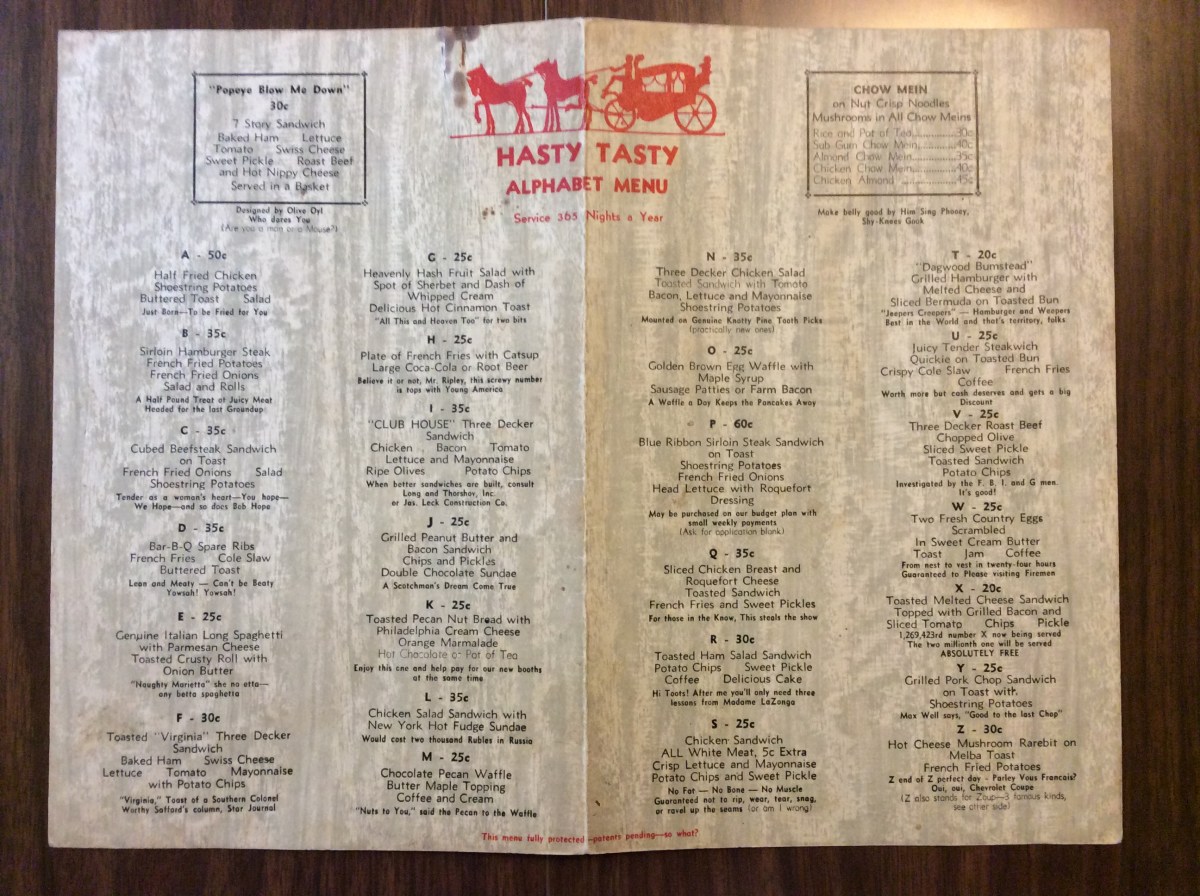 The Gram With a Thousand Rules writes: “My dad must have pilfered this menu on one of his frequent stops to bring home chow mein. He thought the Hasty Tasty (Hennepin Avenue and Lake Street in Minneapolis; 36th Street and Lyndale Avenue South in Minneapolis) had the best-tasting chow mein in town.