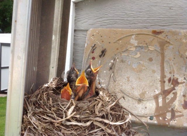 Another close encounter of the natural kind, reported by Mematlily: “Another family of hungry baby robins at the cabin. This year there are four mouths to feed, and mom and dad are very busy! Same nesting spot every year.”