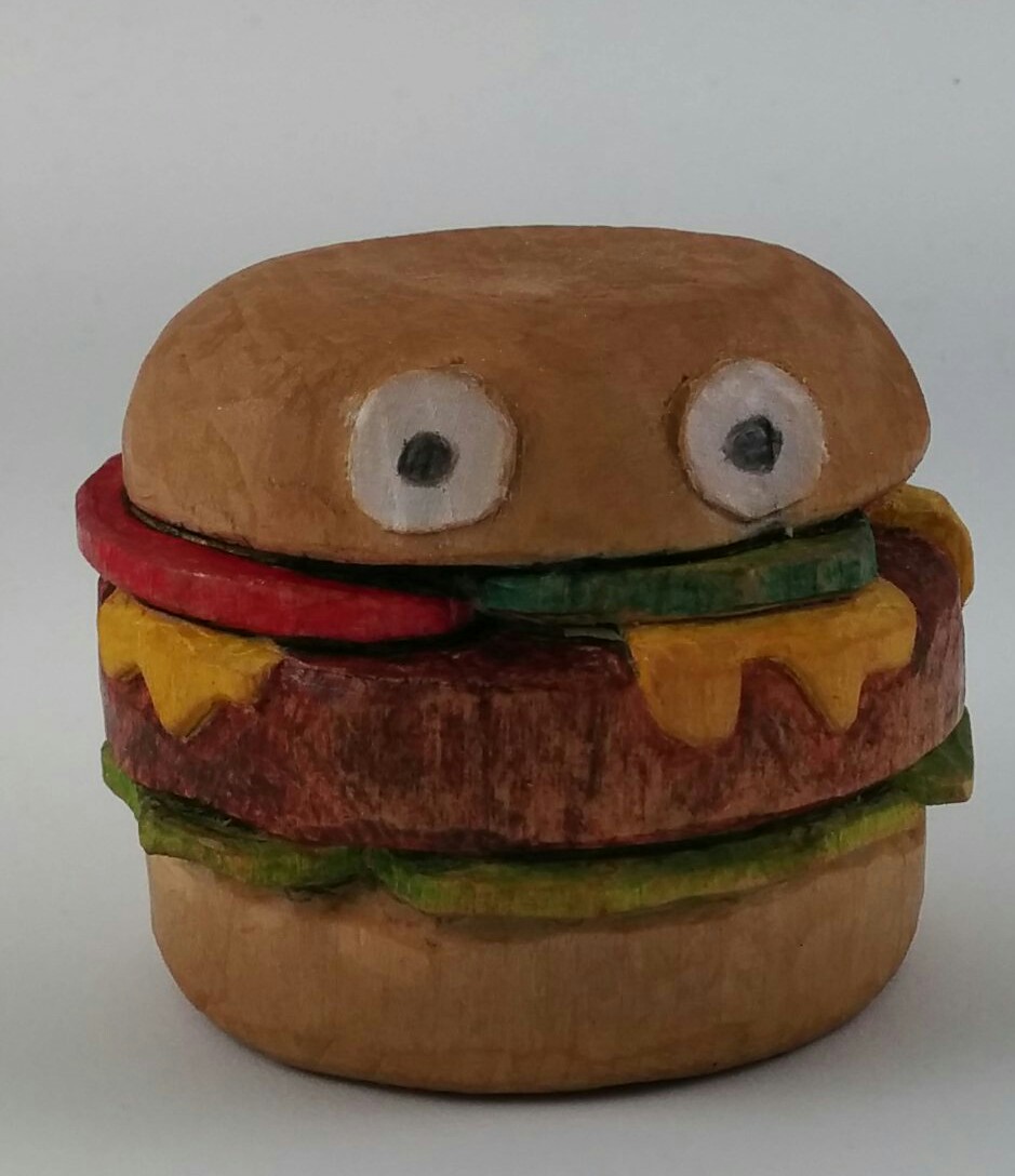 “The hamburger with eyes was a result of my desire to eat hamburgers and an Internet search for pictures of hamburgers.
