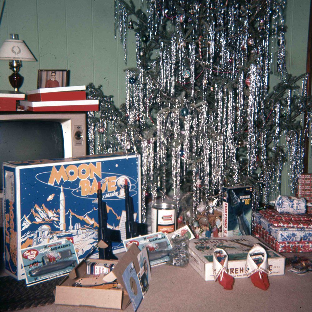 “On Christmas morning, we found a variety of gifts underneath and around our heavily tinseled balsam Christmas tree, but the main ones were a Marx Moon Base set for me and a Marx PREHISTORIC Dinosaur Play Set for my brother. We each also received a toy machine gun, a Missile Firing X-13 Atomic Submarine and other less-lethal-looking toys. While the machine guns only made noise, the submarines and the Moon Base set included enough hard plastic projectiles and launchers to, as the movie says, ‘shoot your eye out, kid,’ and yet we never did.