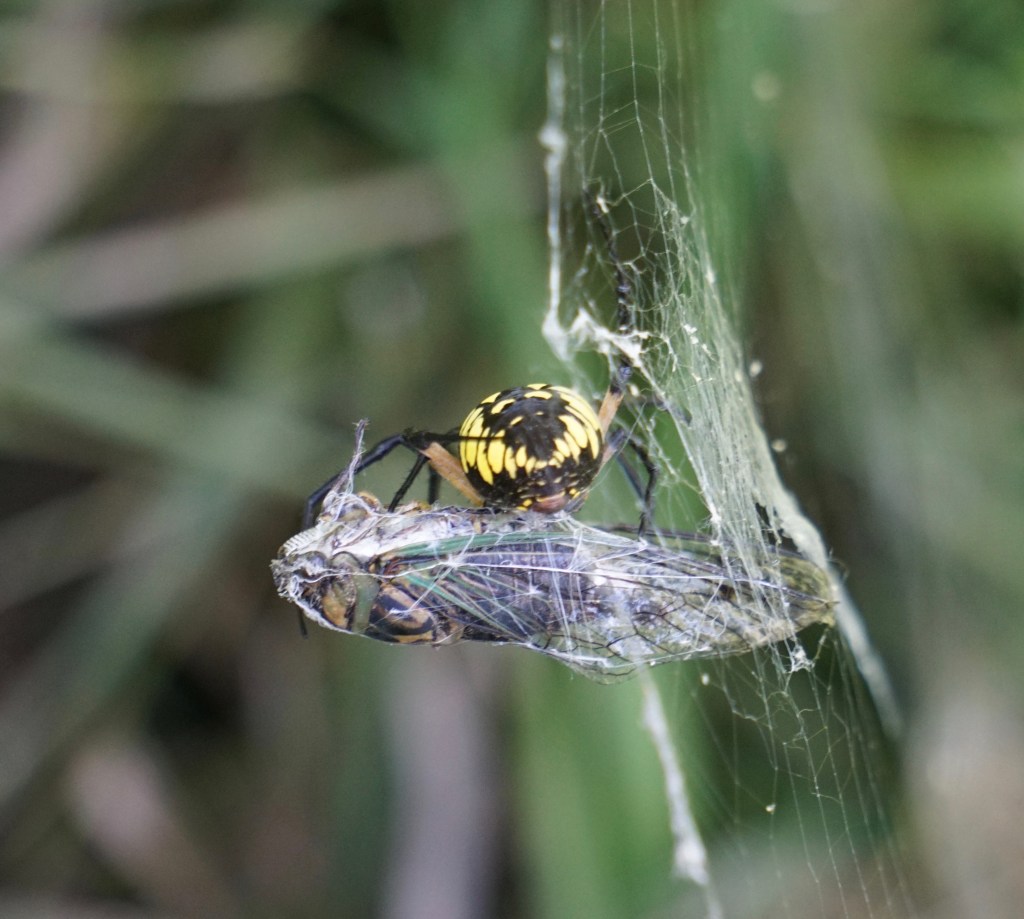 “This Argiope aurantia is using a technique called rotational swathing to wrap a cicada.”