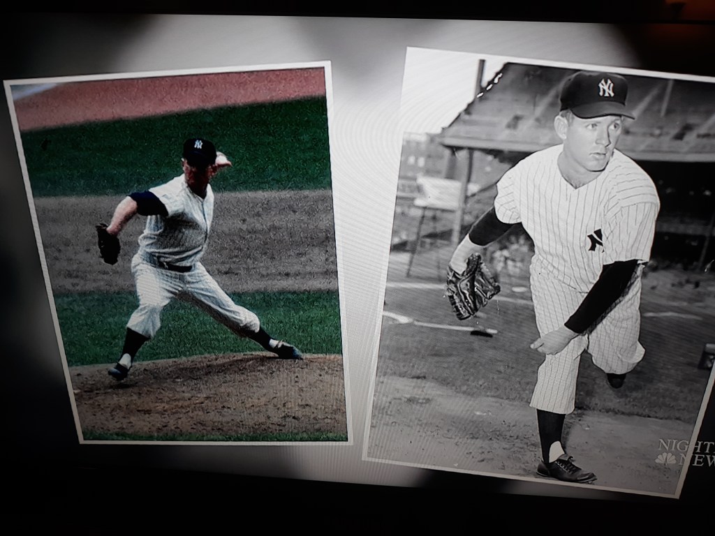“What I didn’t see mentioned by either Gregory or Bulletin Board was the most exciting thing: that Whitey was apparently ambidextrous. I wasn’t aware of this, either, but what a great thing to have on your pitching staff. Imagine, a pitcher who could switch gloves as needed to face either a right- or left-handed batter, or pitch as a lefty one day and come back as a righty the next. How did the Yankees keep this under wraps? How could the sportswriters fail to report on this? Wait — not true, you say? Here’s the proof, from the NBC Nightly News report on his life and career: