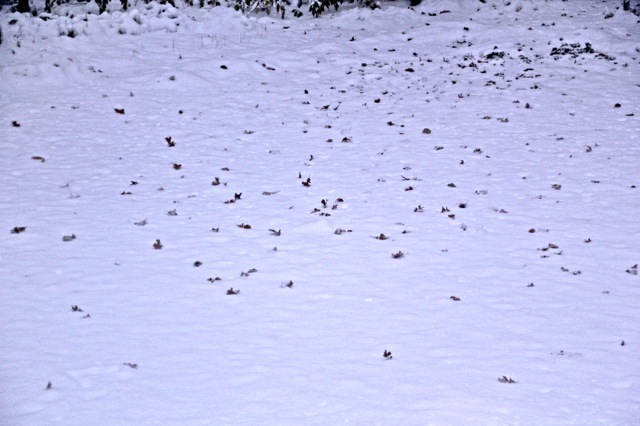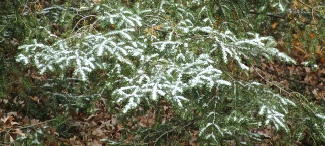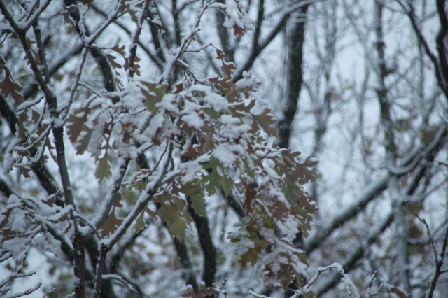 “The Friday-morning snow highlighted some of the remaining leaves . . .
