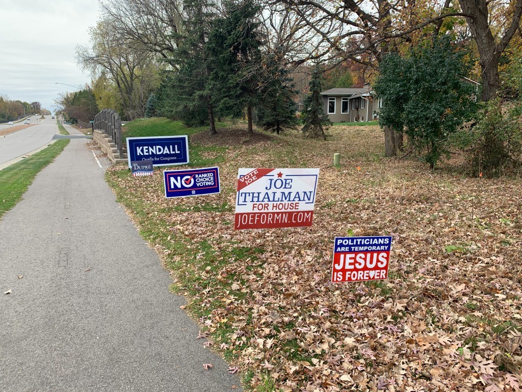 “I found these political lawn signs in Bloomington on Normandale Boulevard, about one mile south of I-494.
