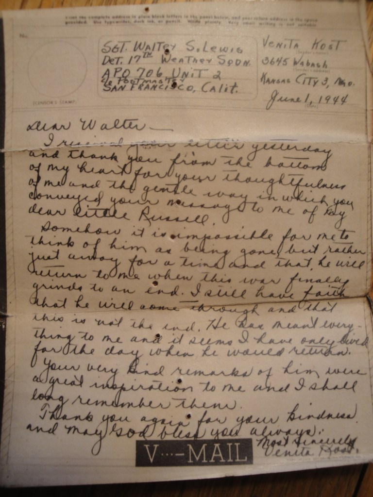 “On an ensuing information flight, Russ’s plane was shot down and he never returned. Walt wrote a letter to Russ’s fiancee telling her of his friendship with Russ and his bravery in flying dangerous missions.
