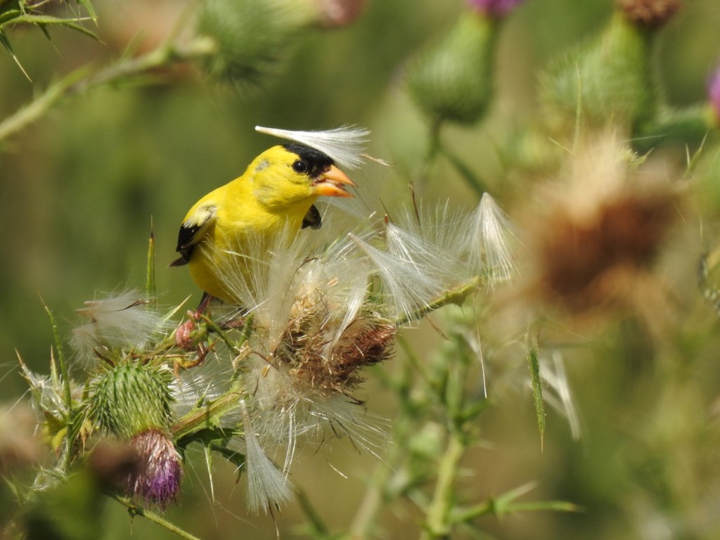 “Sometimes the seed comes out with the down (to fly away and grow new thistles), and sometimes the seed remains (to be eaten by the finch). It seems obvious now, but their actions were so incredibly quick that it took some time to piece it together. Getting the seed requires two steps: Yank some down, and then go into the bud to get the seed(s) left behind.