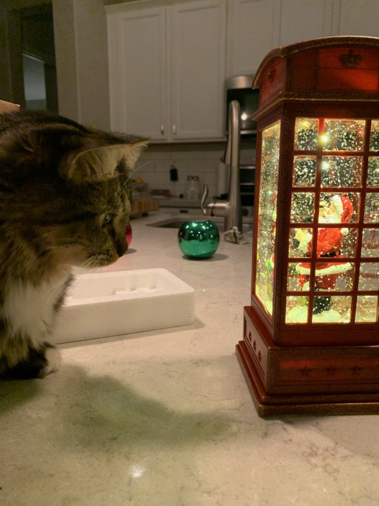 Susan from Arizona: “I’m not a ‘cat person’ myself,but my son and daughter-in-law very much are. Their cat, Thomas, is very mesmerized by this Christmas phone-booth snow globe.