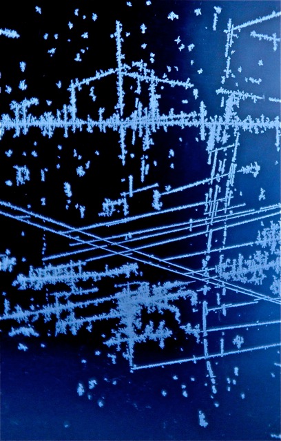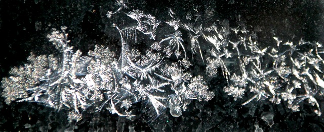“When I go out in the morning to get the newspaper, the warmer moist air from the house hits the storm-door glass and makes it look foggy. The cold turns some of that into frost crystals that I thought I would share with BB readers.