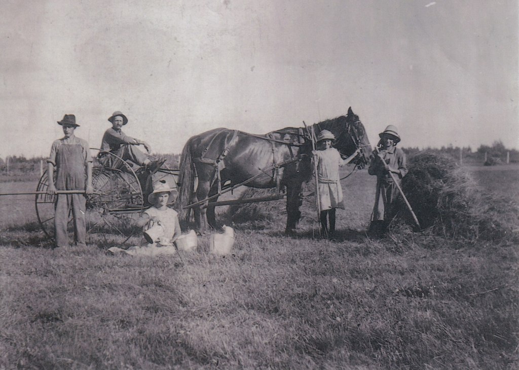 Caption: “The Adolph Olson family making hay in the Warroad area, about 1916.