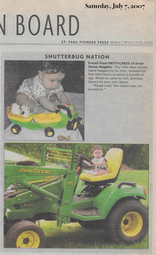 Patty-cakes of Inver Grove Heights reports: “Almost 14 years ago, I sent a picture of our grandson John on his grandpa’s John Deere.
