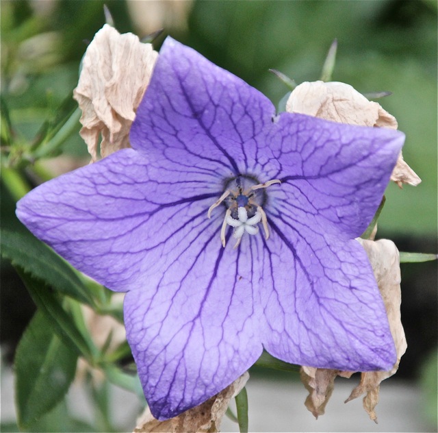 “I can’t remember what the last three blossoms are. Memory is one of the issues I am struggling with these days. Enjoy them anyway!” [Bulletin Board says: We think they are, in order, a “ditch lily” daylily; perhaps a hibiscus; and a balloon flower.]