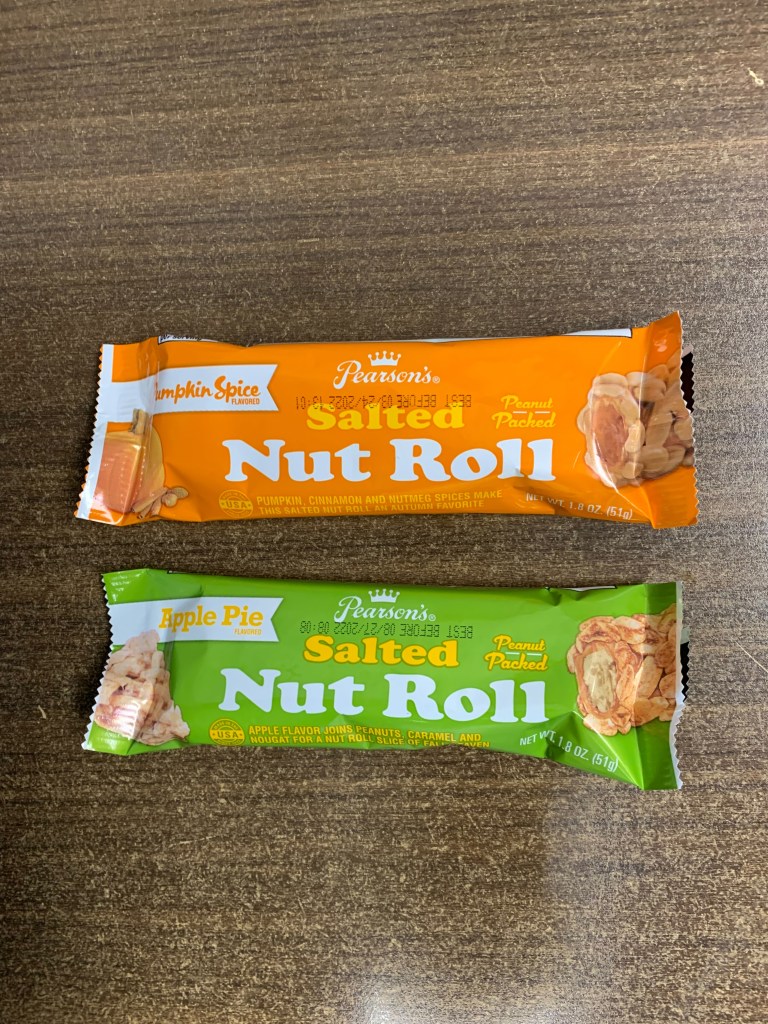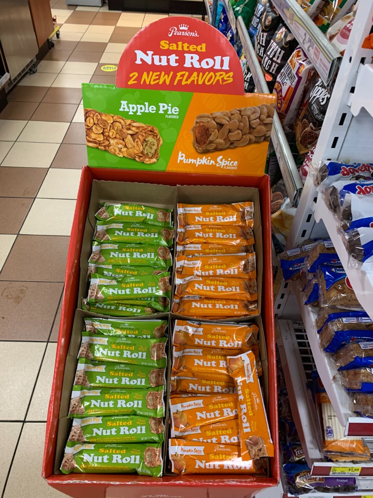 Dennis from Eagan reports: “West Bloomington’s Holiday (gas station) features two seasonal Salted Nut Roll flavors. The usual white nougat turned orange for a pumpkin-spice taste and tan for apple-pie.