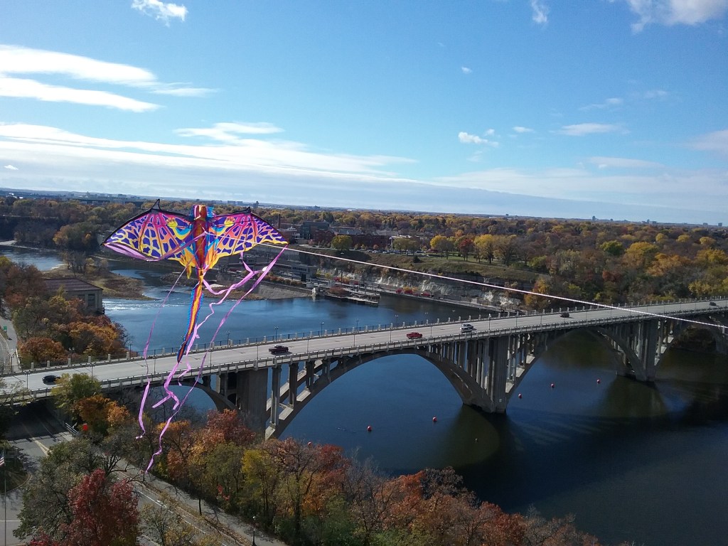 The Mendota Heights Missus (formerly) reports: “On a beautiful fall day overlooking the Mississippi River, we launched the Dragon kite from my 18th-floor balcony. It was quite a challenge, but the Dragon finally took flight! What a thrilling sight to see it fly over our beautiful river!”