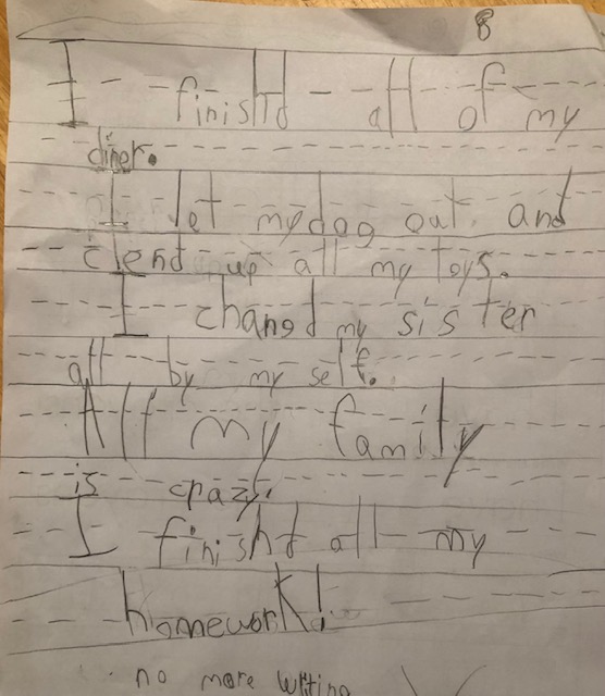WARNING! Cute kid story ahead, from Vertically Challenged: “Granddaughter Adriana is in first grade this year. For homework, the teacher had them write out five sentences using the word ‘all.’ Maybe she wasn’t having the best day, having to think of these sentences, by the time she got to the fourth one. 🤣”