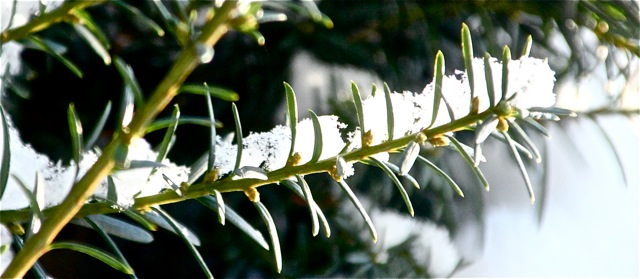 Mounds View Swede‘s camera is enjoying our early-winter snows: “Looking out a lower window, I noticed how some evergreen branches did such a nice job of catching the snow.