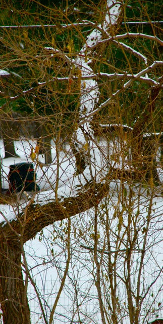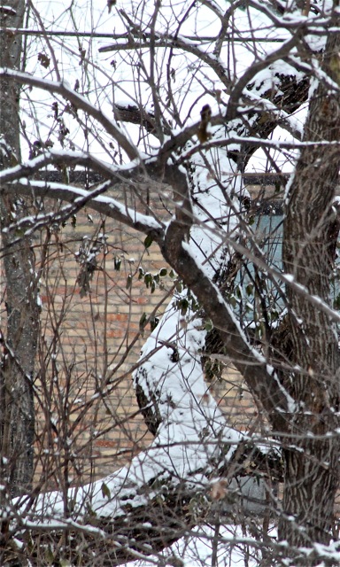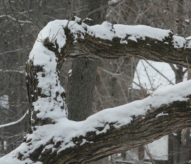 “The snow on the oak limbs helps me notice how some branches really have some dramatic turns in them as they grow towards the light.