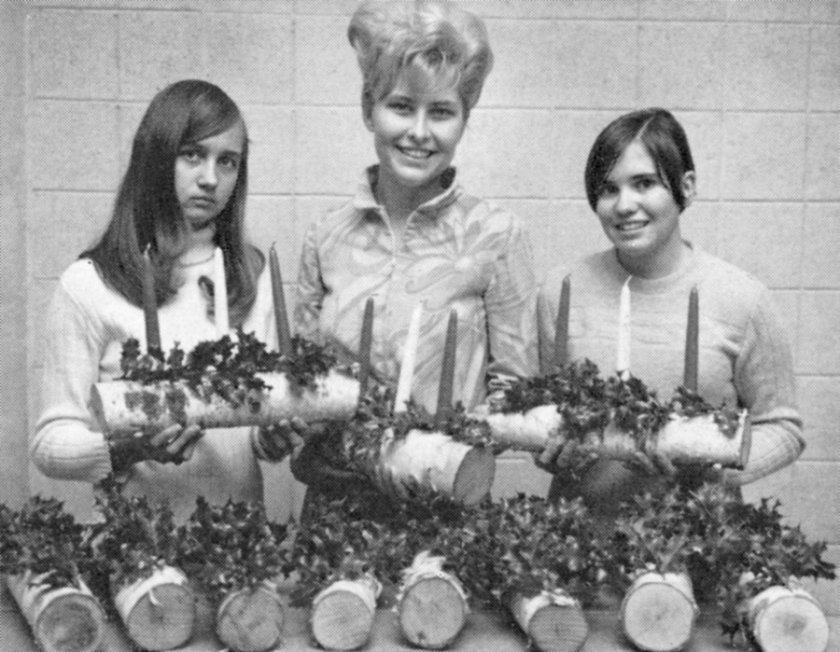 “The Yule Log was purchased by my father in 1967 at the Toni Co., where he worked as a chemist. It was a project of the Tonja Company, a Junior Achievement firm sponsored by the Toni Company. The black-and-white photo comes from the December 1967 issue of the Toni Topics magazine and shows one of the Toni advisors, two student ’employees’ of the Tonja Company, and many of their finished products. Our Yule Log is still alive and well, as shown in the color photo, and has been passed on to my cousin, Cherie D of Inver Grove Heights.