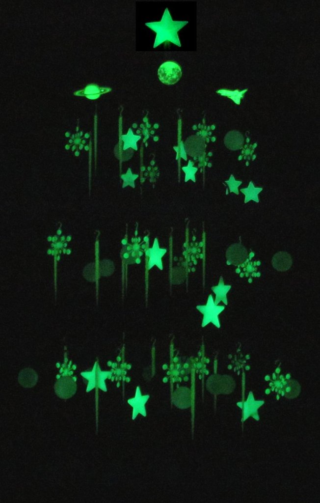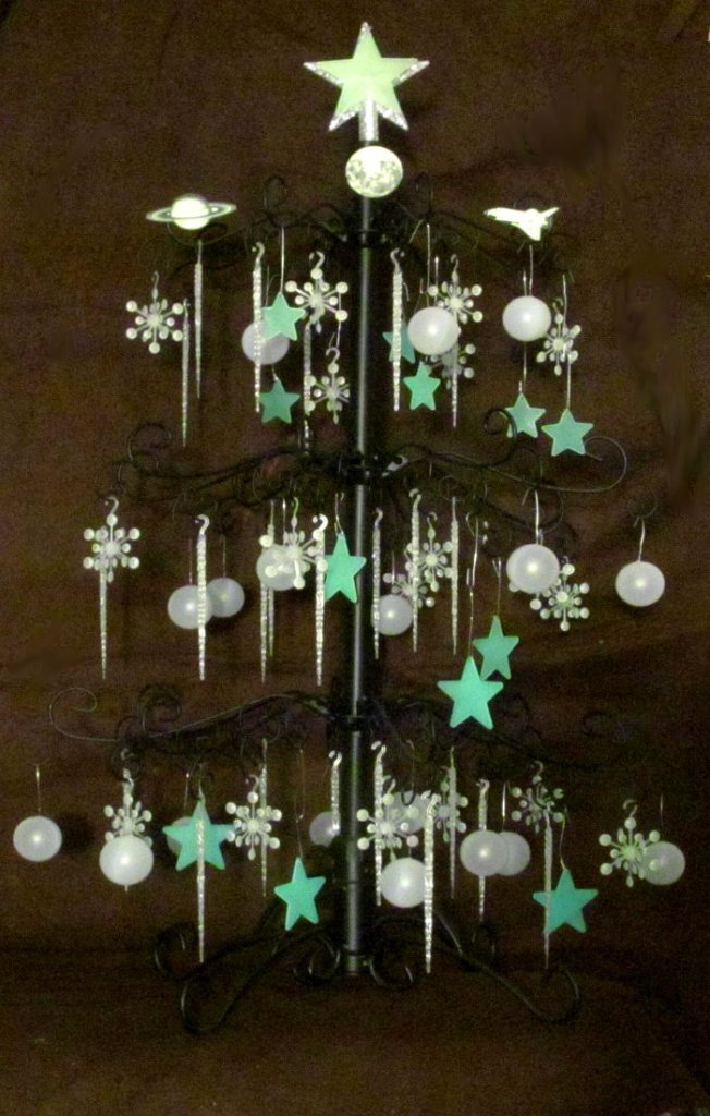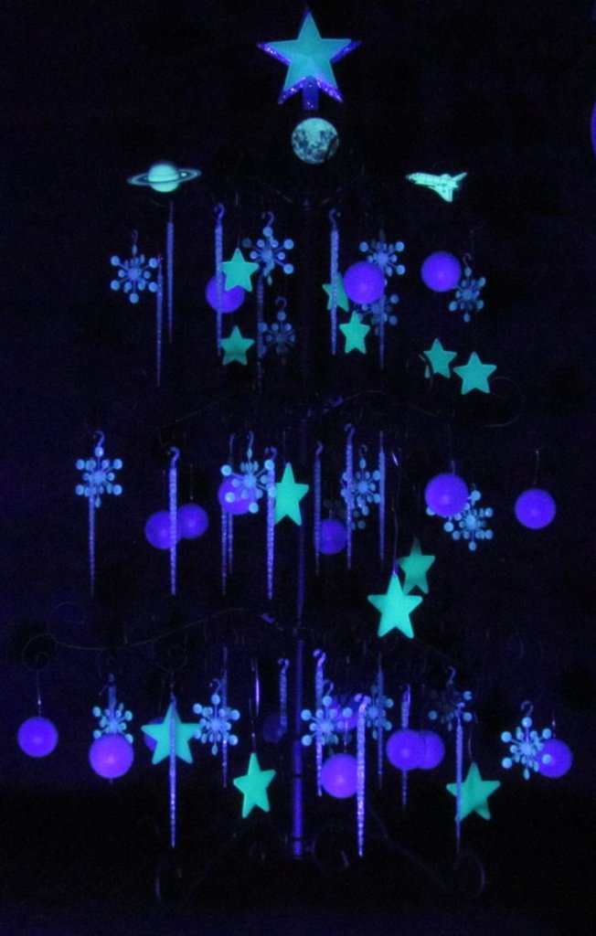 “Be that as it may, I photographed the tree in a variety of lighting conditions: normal white light, blacklight (ultraviolet), and no light to show the glow-in-the-dark quality of the various ornaments. Enjoy.”