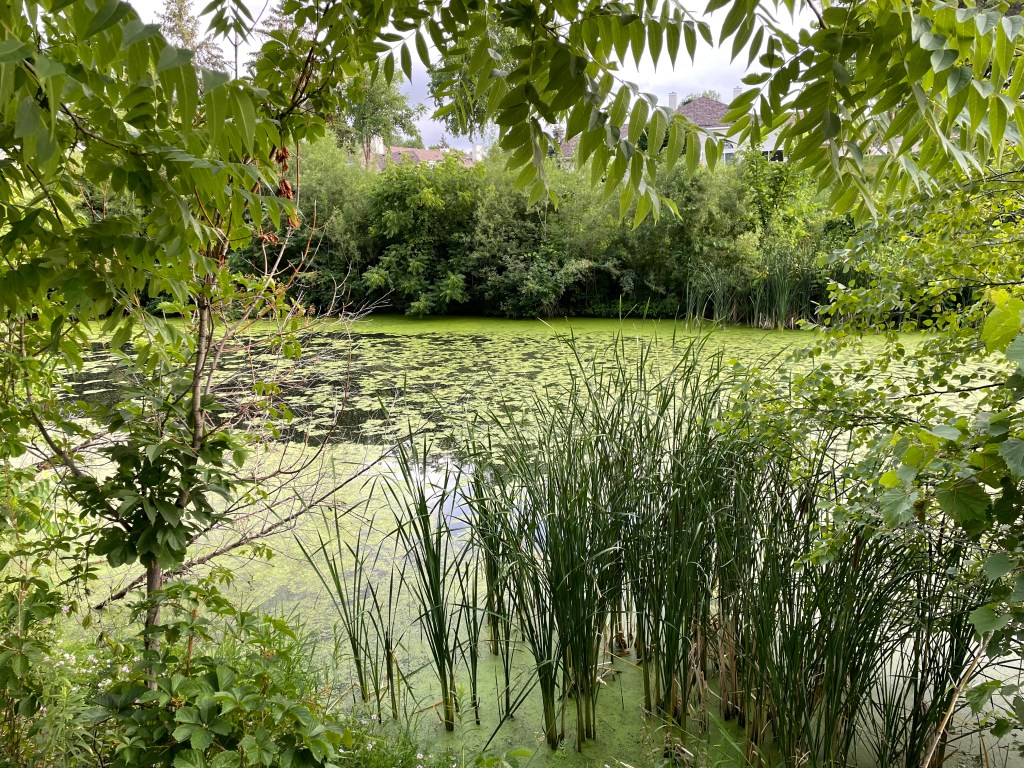 “The pond is about 150 feet by 50 feet and probably 4 to 5 feet maximum depth, and is surrounded on all sides by a fairly steep embankment tangled with weeds, reeds, brush and trees that have grown thick and tall over the years. The water is nearly covered in a layer of algae and lily pads. Despite this, it all makes for a very pleasant scene. And ducks love it.