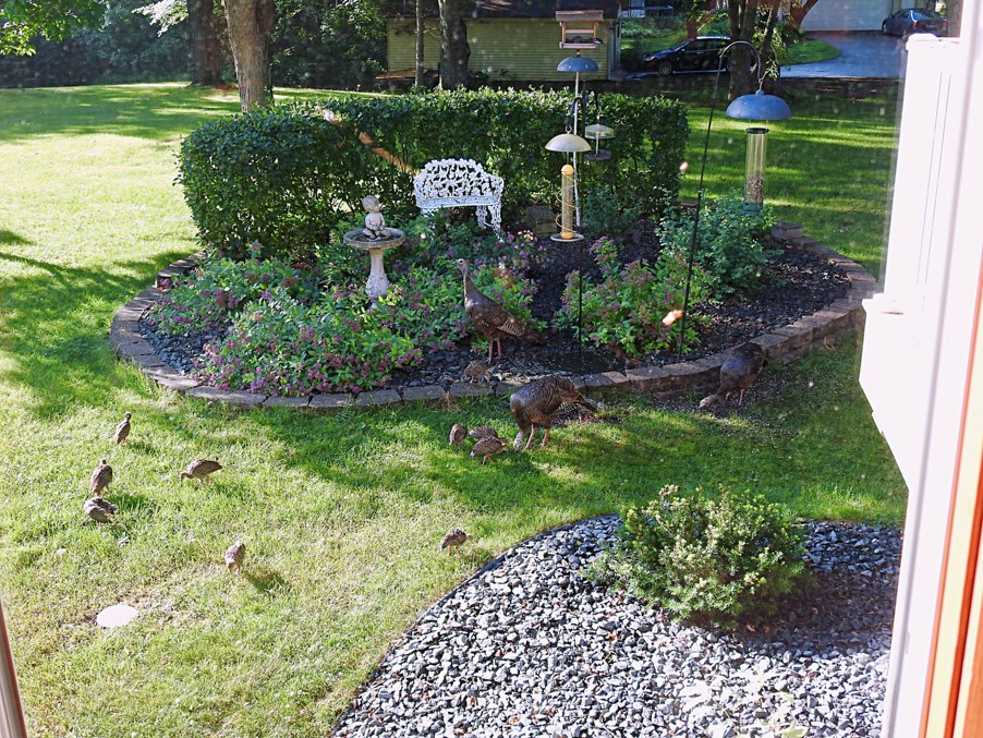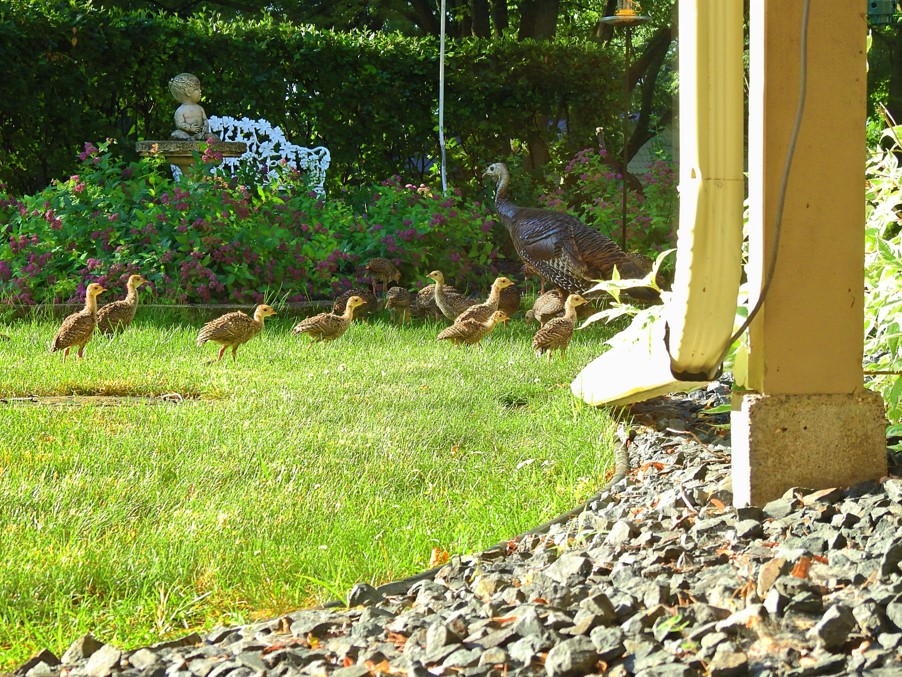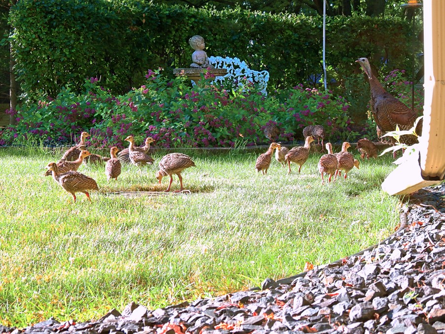 “We now have around 30 new mouths to feed. We have three families of turkeys that have joined forces with all of their new children and are now making the rounds with the neighbors, looking for some food to eat.