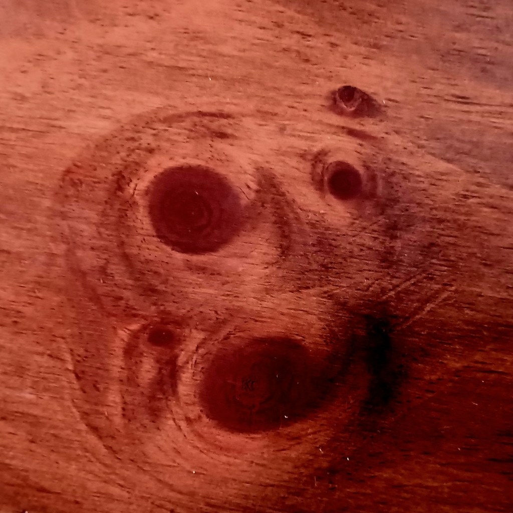 “TeeCee and I sat down in a booth at The Old Salty Dog restaurant in Venice, Florida. Shortly after being seated, TeeCee saw this image of the old salty dog itself in a knot in the wood of the table. It appears to have a broken nose and maybe a black eye.