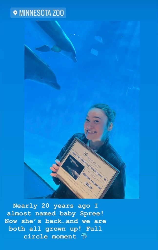 “When it was announced that seven dolphins from Chicago’s Brookfield Zoo would be relocated (while their habitat is being renovated) and temporarily housed at the Minnesota Zoo, Hannah was excited to hear she’d have another chance to see Spree. After waiting patiently for the dolphins to acclimate to their surroundings, guests could once again view and enjoy them again in late December. Hannah proudly brought along her framed certificate on her visit and was as excited as her younger brother for the fun opportunity to see Spree and all the other dolphins.