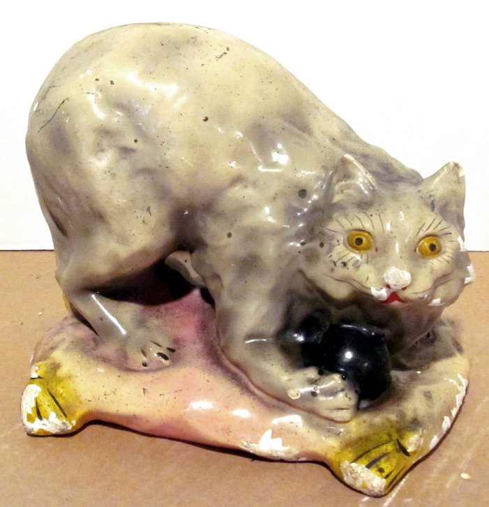 “The previous cats were rather small and not particularly realistic-looking, but Grandpa also made larger ones. There are two cats which are roughly half to three-quarters size and look very lifelike. Unfortunately, they have not aged well, although it is obvious that they once had very nice paint jobs.