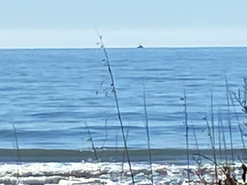 “Sorry for the poor photo, but this ship (there are two, actually) showed up immediately after and has been out there 24/7 — too far out for me to identify, but I’m told both the Coast Guard and the Navy have ships on station out there.