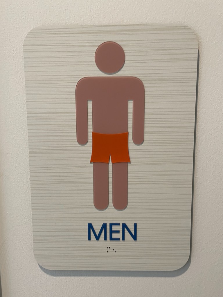 “He wanted to get a photo of the women’s sign, too, which featured a bikini, but there were too many people around for him to feel comfortable walking down a hallway and taking photos outside the women’s restroom door.