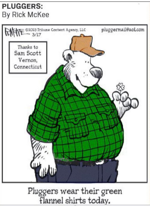 “The caption said: ‘Pluggers wear their green flannel shirts today.’ As I looked in a mirror as I got ready to head out to lunch on St. Paddy’s Day, I could almost have been the model for the ‘Pluggers’ character. The only differences were that my shirt had one pocket instead of two, I was not carrying a shamrock (and if I had been, it would have been a proper three-leafed one), and I have five digits on each hand. I’ve included a copy of ‘Pluggers’ from March 17, with color added to match my ensemble.”