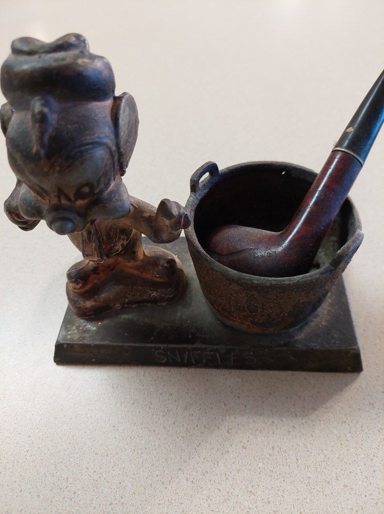 “One of the characters was a cute little mouse named Sniffles. Among my dad’s keepsakes was a statuette designed with a cute mouse standing next to a basket. I remember the statuette from when I was a child. Back then I thought it was an ashtray for pipes, because one of Dad’s pipes was always in the basket. It was actually just a little statue of Sniffles with a spot to keep pens, pencils, whatever you wanted. Dad wanted to keep his pipe there, and so it was.