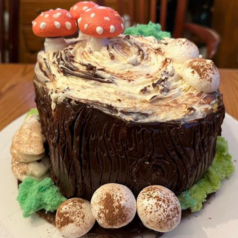 “The neatest of them is a chocolate cake that resembles a tree stump covered with a variety of fungi. Everything on the cake is edible. Amy tried to explain to me how she made the mushrooms, toadstools, lichen, etc. but it was beyond my comprehension.