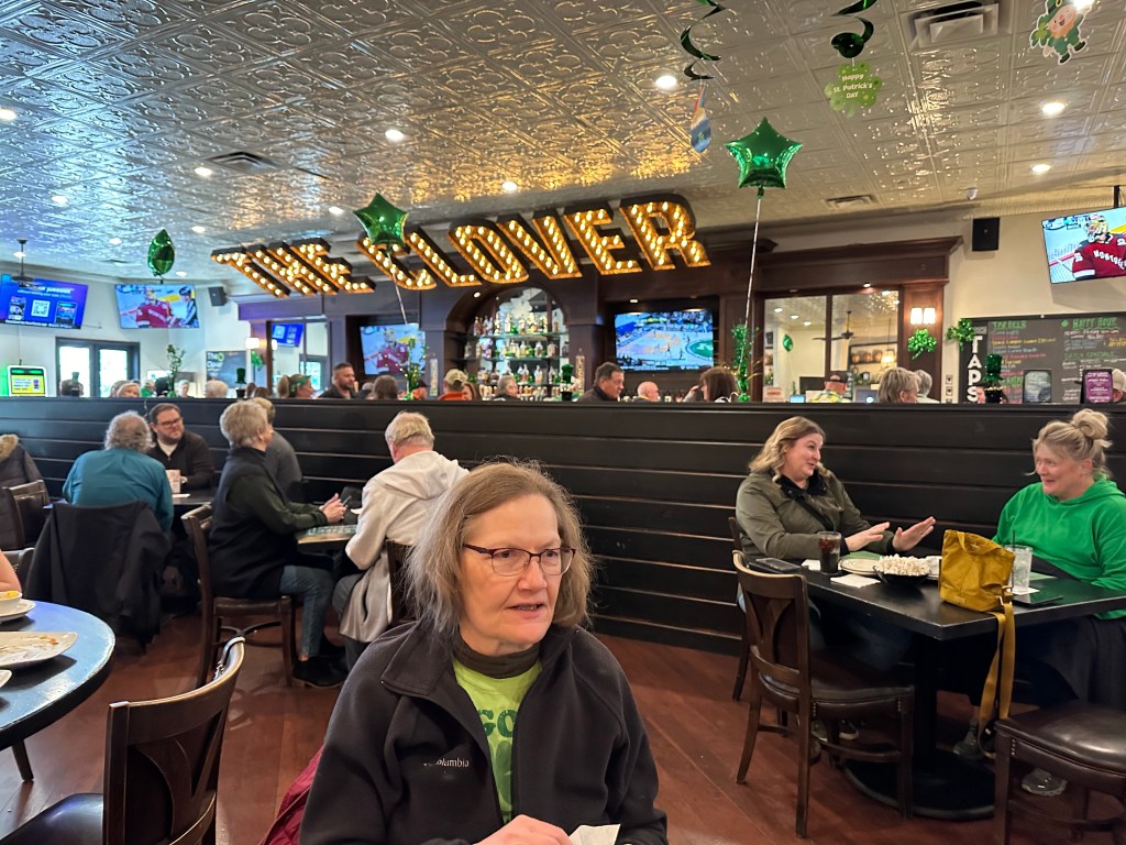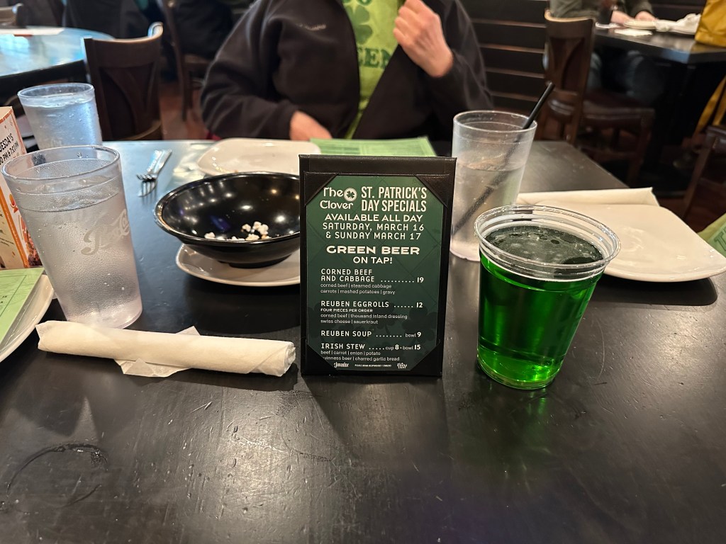 “The football stadium has ‘IRISH’ painted in the end zone, but the fun today is at The Clover’s MARQUEE bar for a LIGHT meal washed down with green beer. The men’s room even had a URINAL ETIQUETTE FOR KILTS mural.