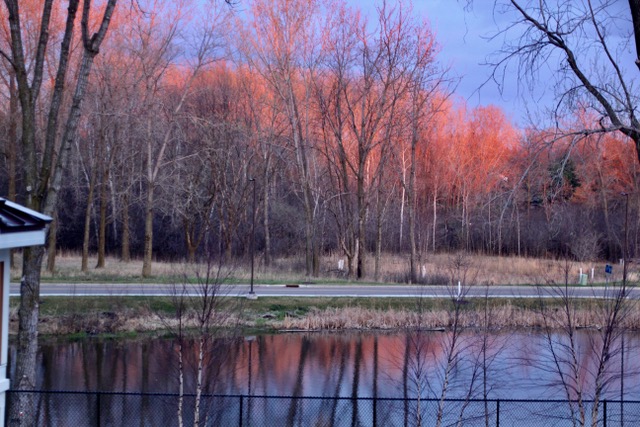 “On April 18th of this year when the sun was setting, its orange light made the bare trees look like fall. It was a delight to see — fall colors in spring!”