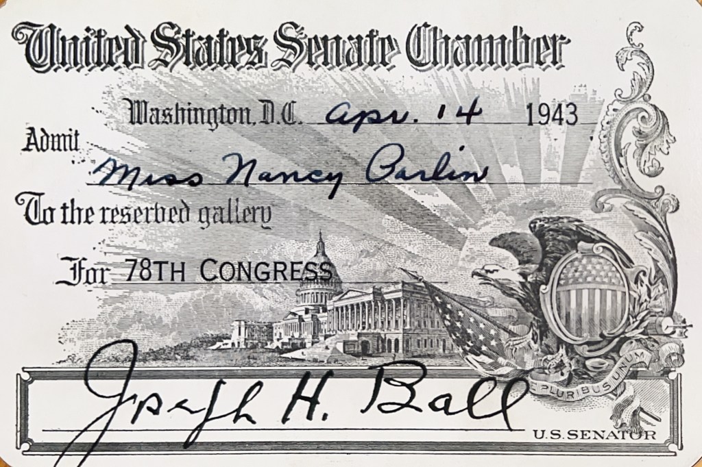 “In the box were ration books for all four of our family members, as well as I.D. cards for admission to the House and Senate. One of these was signed by U.S. Senator (from Minnesota) Joseph Ball. [Bulletin Board interjects: And not just a senator, but also a columnist for your beloved St. Paul Pioneer Press!]